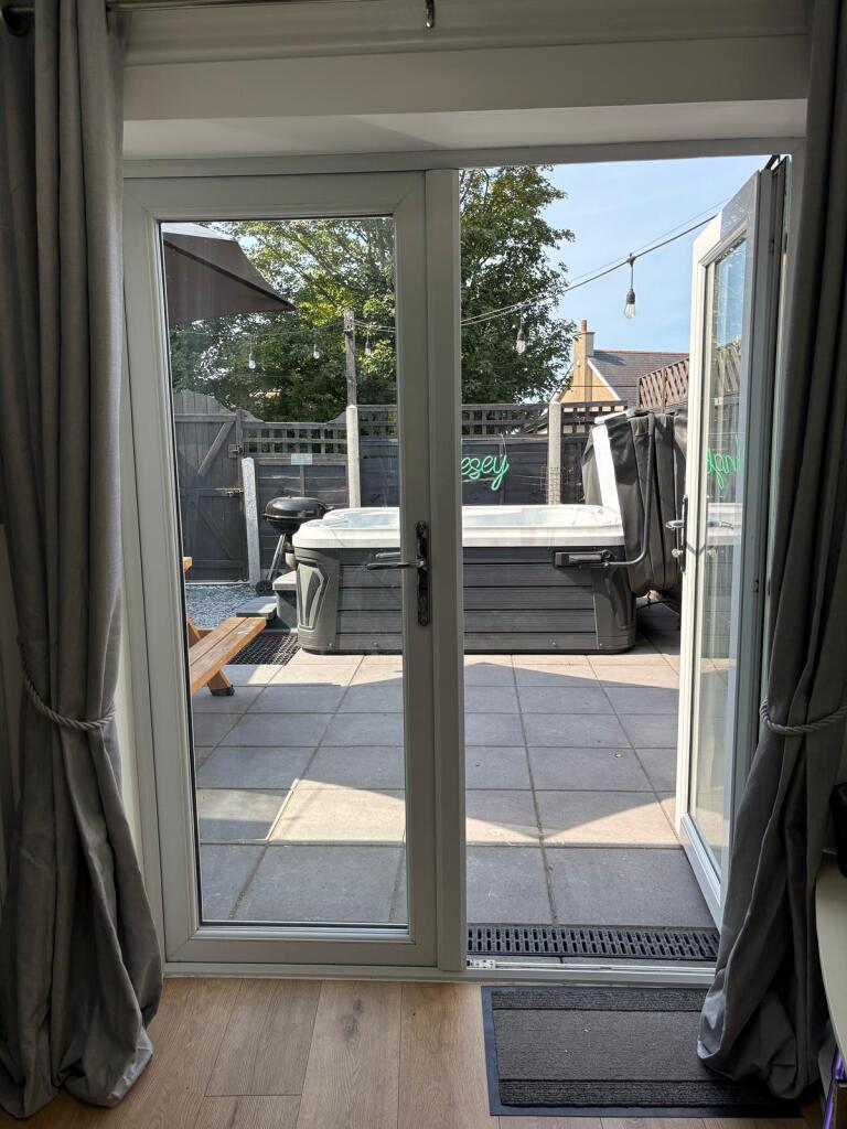 Sunset Garden – West-facing patio, perfect for BBQ evenings with pub-style seating, patio heater, and warm lighting.