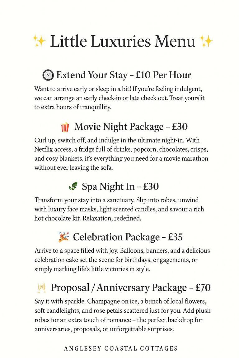 Within 10 minutes you can reach golden Llanddwyn Beach (Newborough), Anglesey Sea Zoo, and Halen Môn salt works — ideal for family fun, seaside walks, or exploring Anglesey’s heritage.